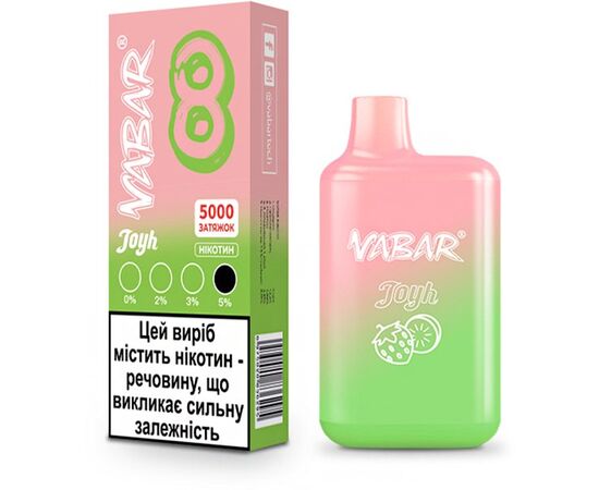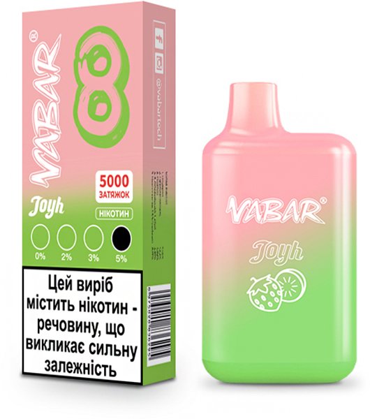 Электронная сигарета Vabar Joyh 5000 8 Клубника Киви - отличное решение для легкого и беззаботного вейпинга. Это одноразовое устройство, которое не требует дозаправки. Поставляется с уже заправленной жидкостью, после окончания ресурса которой подлежит утилизации. Повторная заправка конструкцией не предусмотрена. Характеризуется стабильной и безотказной работой, а также ярким и насыщенным вкусом.