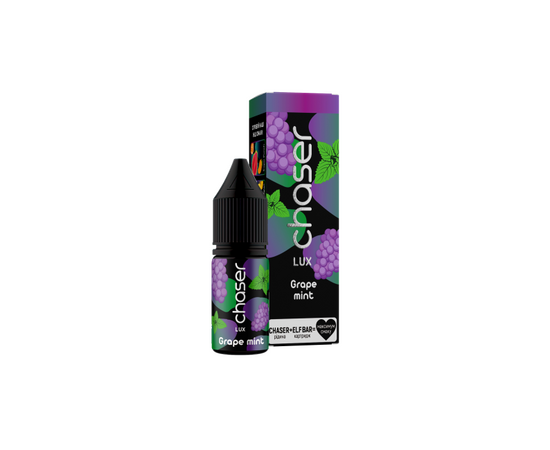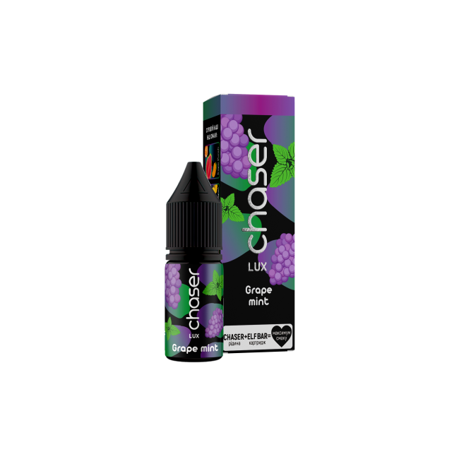 Жидкость Chaser LUX Grape Mint (Чейзер Виноград Мята) 11мл, 6,5% - отличное решение для вашего вейпа. В состав продукта входят исключительно качественное сырье, включительно с солевым никотином, ароматизаторы от известных производителей, а также пищевой глицерин и пропиленгликоль медицинского качества. Жидкость предназначена для использования в вайпах с небольшой мощностью. 1 флакона хватает на несколько заправок.
