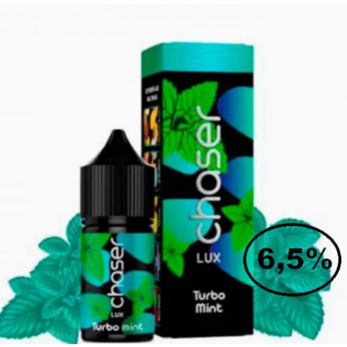 Жидкость Chaser LUX Turbo Mint (Чейзер Люкс Турбо Мята) 30мл 6,5% - премиальная серия от Украинского бренда, которая производится из лучших ароматизаторов из США. Продукт рекомендован для вейпинга на POD-системах с небольшим уровнем мощности. Жидкость обладает высоким уровнем содержания никотина, подходит для людей с сильной зависимостью от никотина. Продукт характеризуется ярким вкусом и густым ароматным дымом.