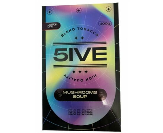 Табак 5IVE medium Mushrooms Soup (Грибной Суп) 100грамм - это продукт нового Украинского бренда, который производит лучшие курительные смеси из качественного сырья. Табак отвечает высоким международным стандартам и производится из отборного табачного листа премиального качества двух сортов, Золотая Вирджиния и Барли. Листья имеют мелкую нарезку, хорошо пропитаны в сиропе и за счет этого имеют превосходные показатели дымности и жаростойкости.