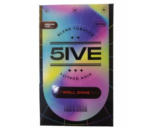 Табак 5IVE medium Well Done (Мясо) 100грамм отличается средним уровнем крепости, производится в Украине из лучшего сырья, такого как отборный табачный лист премиальных сортов Золотая Вирджиния и Барли. Продукт характеризуется высоким уровнем жаростойкости и отличной передачей вкуса. Табачный лист нарезан мелко и щедропропитан в сиропе из глицерина, патоки и пищевых ароматизаторов.
