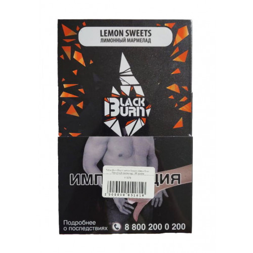 Burn Black Lemon Sweets. Вкусный мармелад с кислинкой и ярким цитрусовым ароматом лимона. Курительная смесь для кальяна премиального качества Burn производится в США. Наслаждаться кальяном можно до 1 часа. С табачной смесью легко работать, она обладает отличными показателями жаростойкости. В качестве сырья используется табачный лист премиального качества Virginia Gold выращенный во Франции. Крепость заправки для кальяна высокая.