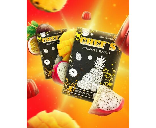 Табак Chefs Tropical Jelly (Тропические Желейки) 40гр - производится в Украине из компонентов высокого качества. Продукт доступен за демократичную цену, по качеству не уступает более известным мировым брендам премиального качества. В составе продукта находится достаточное количество жидкости. В состав курительной смеси не входят красители и другие химические вещества. В кальяне табак проявляется как дымный, ароматный и жаростойкий.