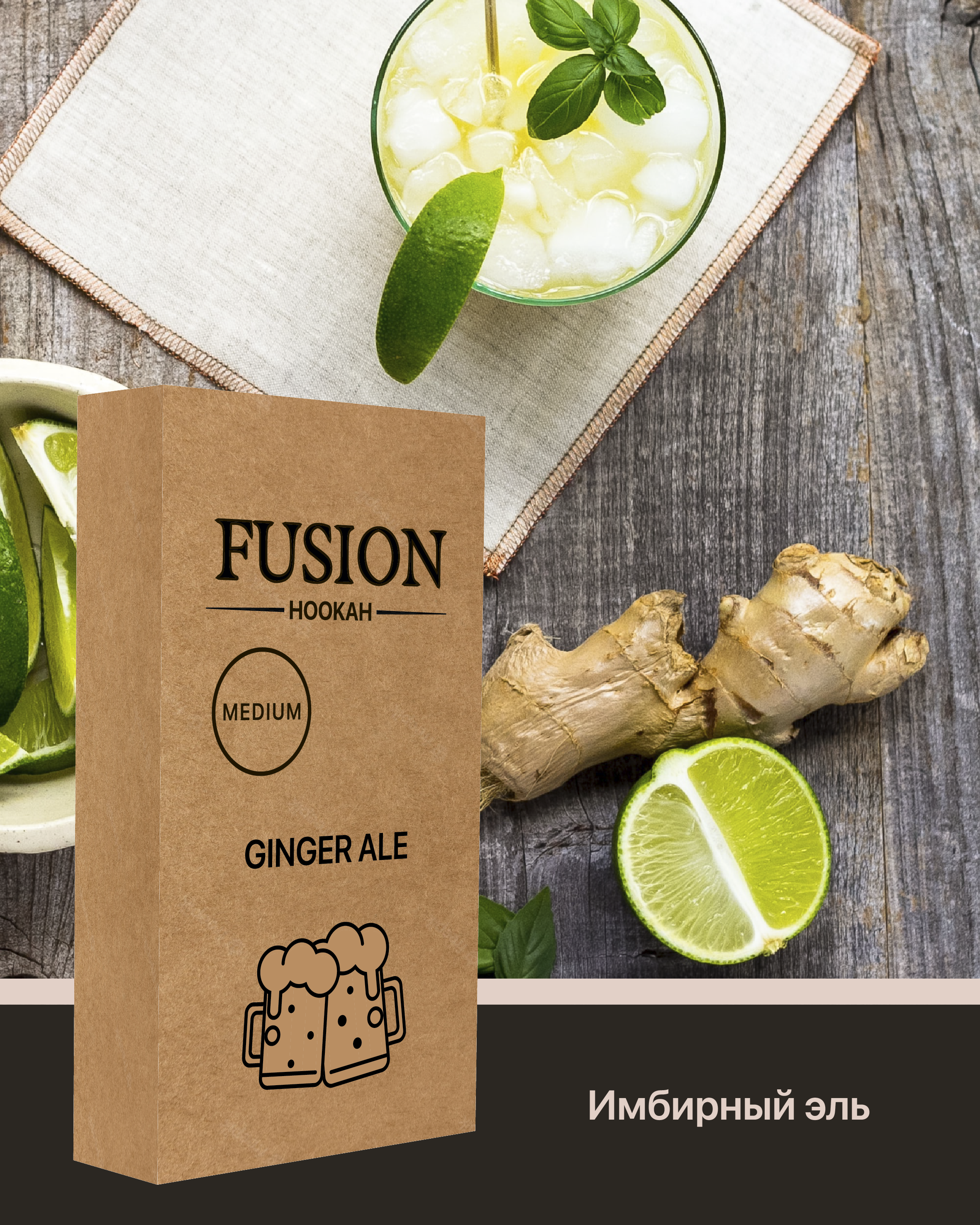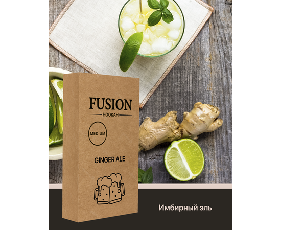 Табак Fusion Medium Ginger Ale. Слегка пьянящие нотки эля идеальны в сочетании с пикантным имбирем. Это Украинский бренд табаков для кальяна, который производится из отборных листьев сорта Burley, а также ароматизаторов Германского производства высокого качества. Во время табак курения характеризуется приятным ароматом и большим количеством дыма. Серия Medium отличается средним уровнем крепости. Табак поставляется в удобных картонных 100 граммовых упаковках.