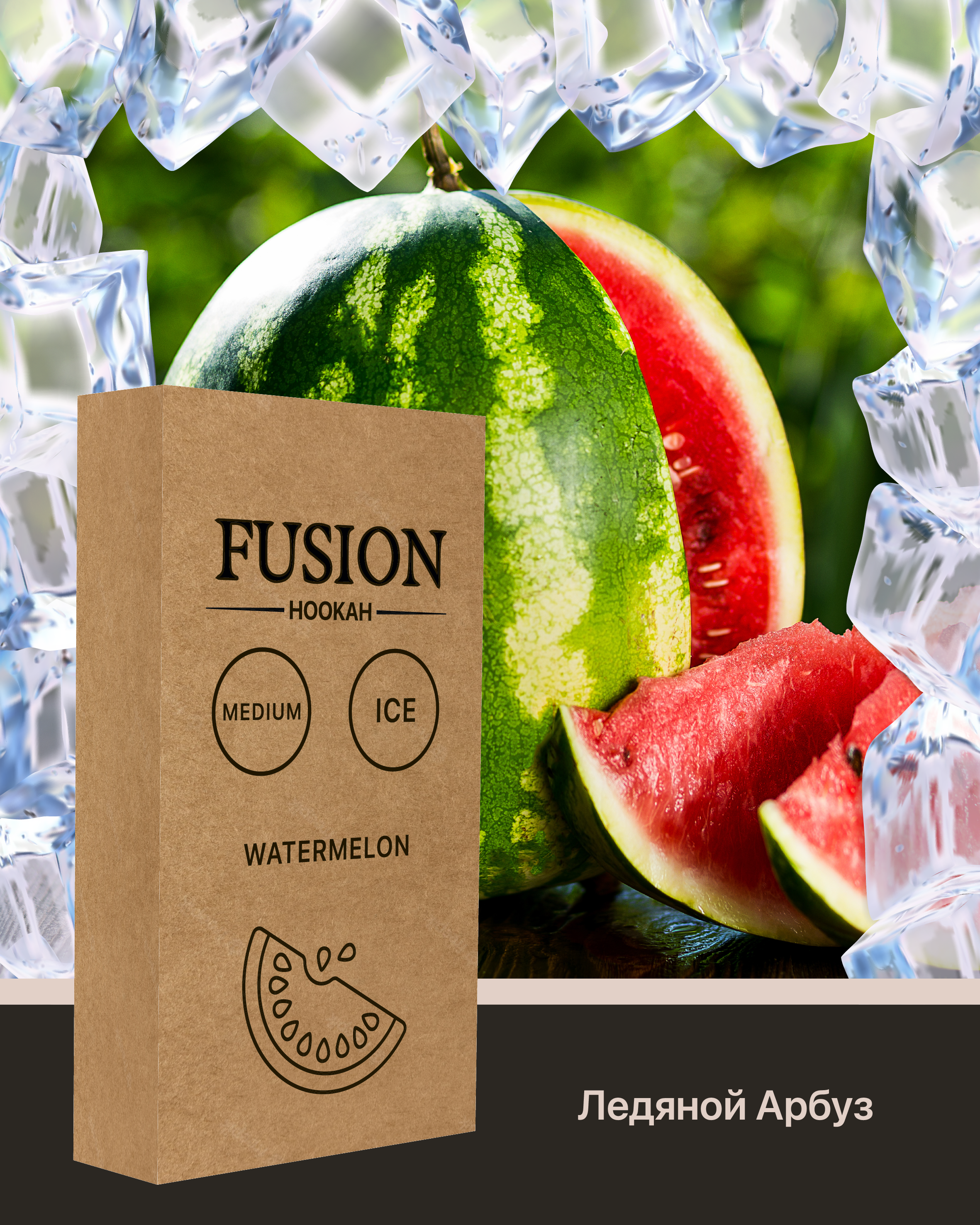 Табак Fusion Medium Ice Watermelon. Ароматный и сладкий арбуз идеален в сочетании с морозной прохладой. Это Украинский бренд табаков для кальяна, который производится из отборных листьев сорта Burley, а также ароматизаторов Германского производства высокого качества. Во время табак курения характеризуется приятным ароматом и большим количеством дыма. Серия Medium отличается средним уровнем крепости. Табак поставляется в удобных картонных 100 граммовых упаковках.