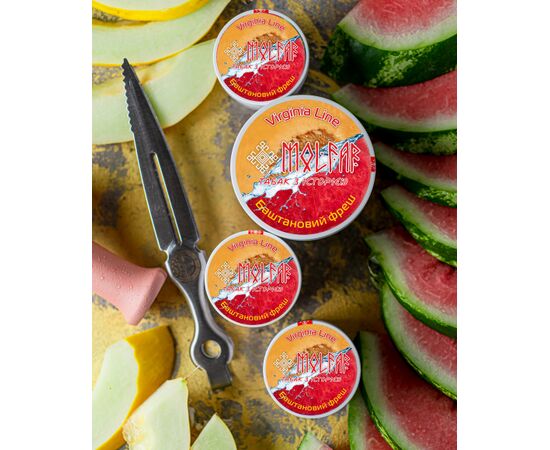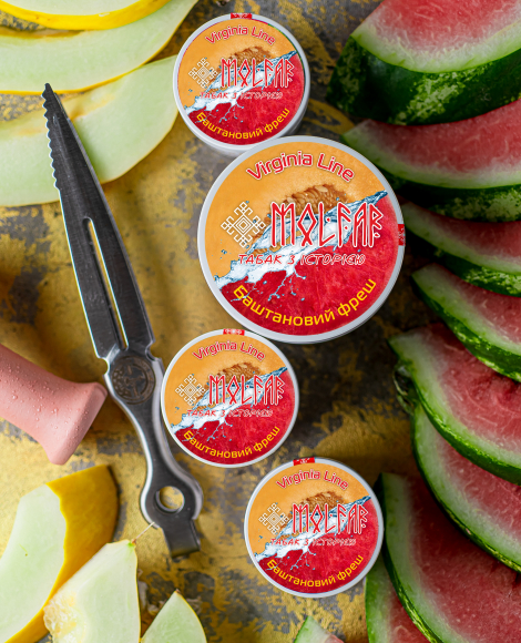 Табак Molfar Virginia Баштановий Фреш (Арбуз Дыня Лёд) 40 гр - украинский бренд табака для кальяна, производимый вручную в Закарпатье. Название происходит от карпатского слова "мольфар", обозначающего знахаря или колдуна в гуцульской культуре. Относится к линейке Virginia. Табак подходит как для самостоятельного использования, так и для создания миксов. Популярность бренда "Мольфар" обусловлена сочетанием высокого качества, натуральности ингредиентов, отличной жаростойкости, хорошей вкусопередачи и доступной цены.