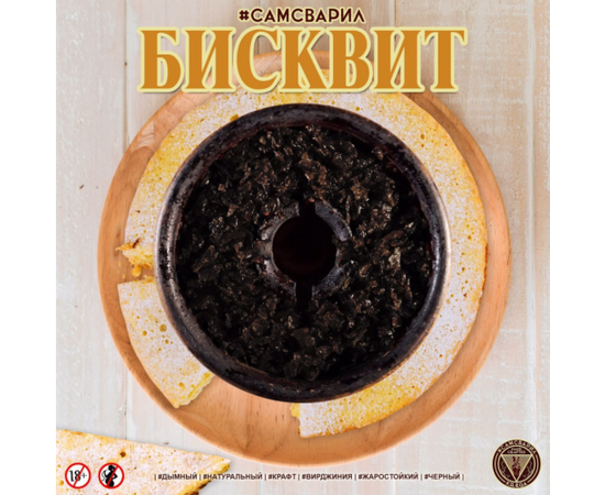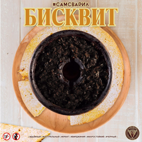 Табак Сам Сварил Бисквит 100 грамм. Аромат приятной бисквитной выпечки заполняет пространство вокруг вместе с густым табачным дымом. Крафтовая заправка для кальяна Сам Сварил отличается оригинальной концепцией и производится из ингредиентов премиум качества, таких как табачный лист Золотой Вирджинии. Цвет смеси - необычный для Вирджинии черный, это из-за особой обработки. В составе смеси находятся ароматизаторы из Германии и Украины. Сиропа в упаковке немного, нарезка средняя.