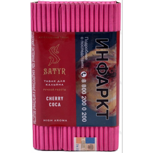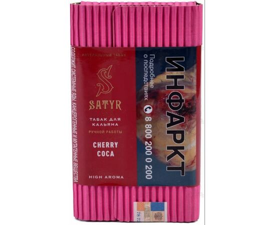 Табак Satyr Cherry Coca (Сатир Вишня Кока) | Aroma Line 100 грамм - это уникальный продукт с высоким уровнем крепости, который рассчитан на каждодневный покур. Природный высокий уровень никотина обеспечивается благодаря бленду немытых табачных листьев из разных сортов. Жидкий никотин в заправке не используется. Благодаря качественным ароматизаторам сертифицированным для пищевой промышленности обеспечивается натуральный яркий вкус вишни.