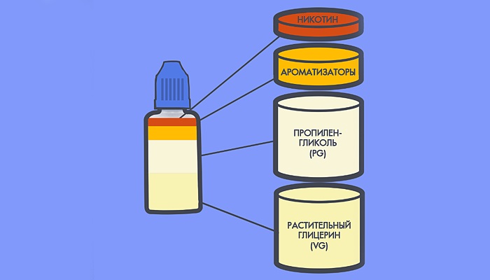 VG розшифровується як Vegetable Glycerin – рослинний гліцерин у перекладі. PG - відповідно пропіленгліколь. Якість рідини для електронної сигарети залежить від співвідношення цих двох речовин, а конкретніше від них залежить димність і в'язкість жижи. Чим більше гліцерину тим густіша жижа та дим відповідно. При цьому пара не дратує горло. Чим більше пропіленгліколю тим більше рідка рідина, пара стає рідше, але є деякі неприємні відчуття в горлі.