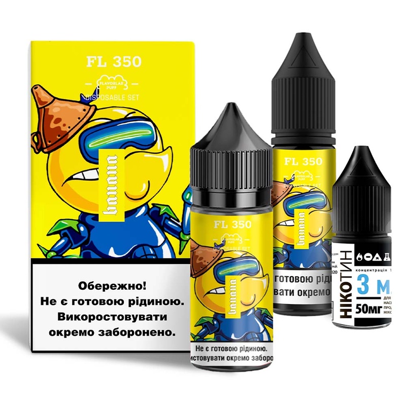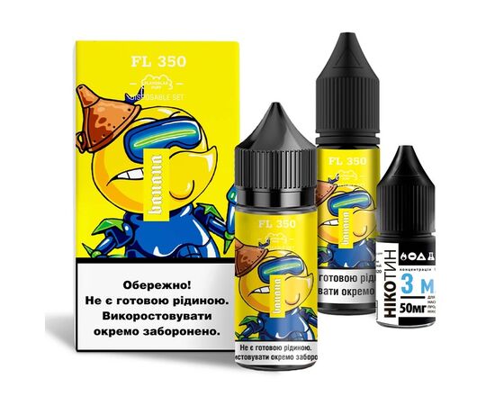 Рідина Набір Flavorlab FL350 Banana (Банан) 30мл 5% - створіть ідеальну рідину для максимально комфортного досвіду вейпінгу. Набір для самозамісу складається виключно із компонентів високої якості. Нікотин ви можете додати на свій розсуд. Якщо додасте весь нікобустер вийде 5% міцності, половину – 2,5%. Нікотин можна не додавати взагалі, вийде жижа з 0% міцності. Змішувати самозаміс потрібно у флаконі з ароматизатором, там достатньо порожнього місця.