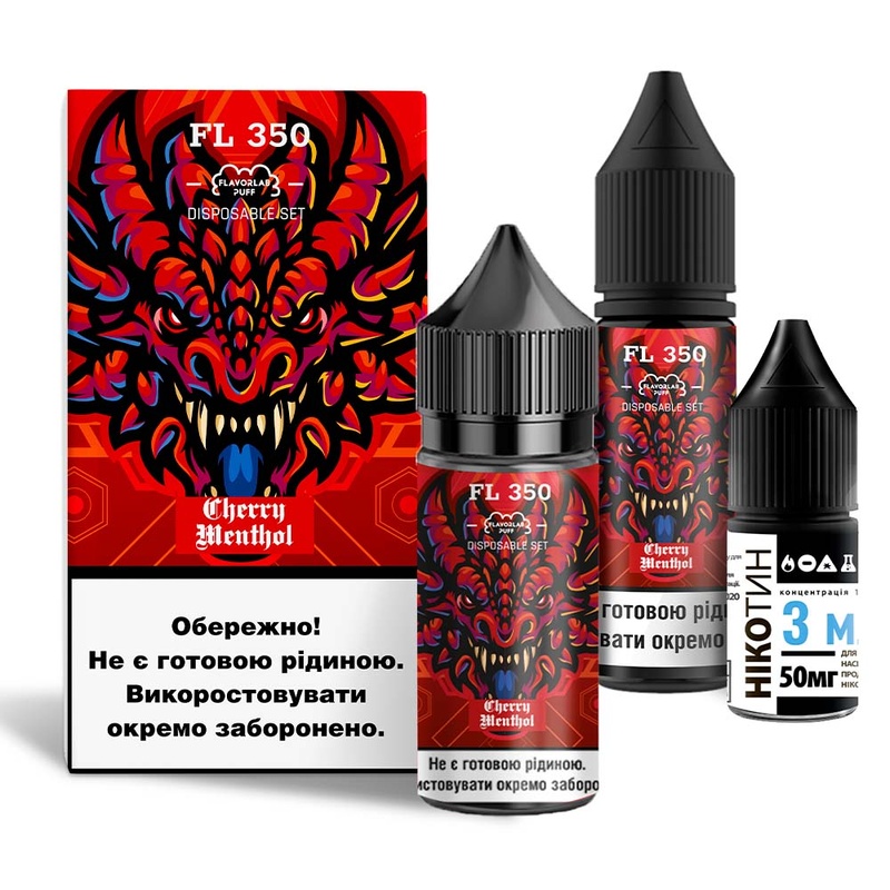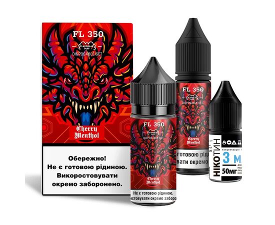 Рідина Набір Flavorlab FL350 Cherry Menthol (Вишня Ментол) 30мл 5% - створіть ідеальну рідину для максимально комфортного досвіду вейпінгу. Набір для самозамісу складається виключно із компонентів високої якості. Нікотин ви можете додати на свій розсуд. Якщо додасте весь нікобустер вийде 5% міцності, половину – 2,5%. Нікотин можна не додавати взагалі, вийде жижа з 0% міцності. Змішувати самозаміс потрібно у флаконі з ароматизатором, там достатньо порожнього місця.