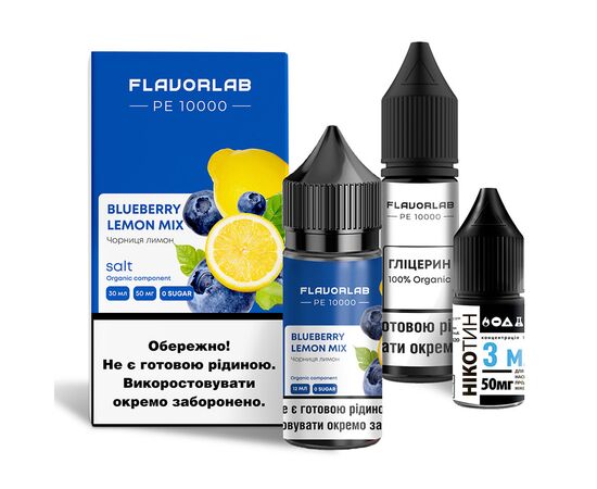 Рідина Набір Flavorlab PE 10000 Blueberry Lemon Mix (Чорниця Лимон) 30мл 5% - створіть ідеальну рідину для максимально комфортного досвіду вейпінгу. Набір для самозамісу складається виключно із компонентів високої якості. Нікотин ви можете додати на свій розсуд. Якщо додасте весь нікобустер вийде 5% міцності, половину – 2,5%. Нікотин можна не додавати взагалі, вийде жижа з 0% міцності. Змішувати самозаміс потрібно у флаконі з ароматизатором, там достатньо порожнього місця.