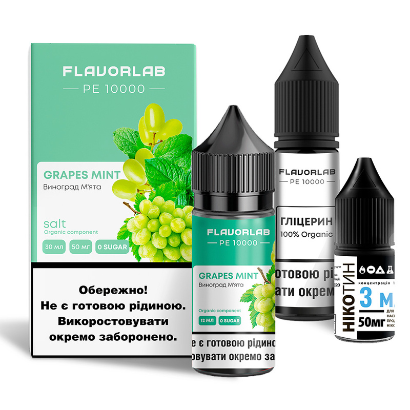 Рідина Набір Flavorlab PE 10000 Grape Mint (Виноград М'ята) 30мл 5% - створіть ідеальну рідину для максимально комфортного досвіду вейпінгу. Набір для самозамісу складається виключно із компонентів високої якості. Нікотин ви можете додати на свій розсуд. Якщо додасте весь нікобустер вийде 5% міцності, половину – 2,5%. Нікотин можна не додавати взагалі, вийде жижа з 0% міцності. Змішувати самозаміс потрібно у флаконі з ароматизатором, там достатньо порожнього місця.