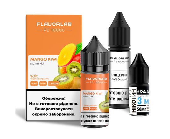 Рідина Набір Flavorlab PE 10000 Mango Kiwi (Манго Ківі) 30мл 5% - створіть ідеальну рідину для максимально комфортного досвіду вейпінгу. Набір для самозамісу складається виключно із компонентів високої якості. Нікотин ви можете додати на свій розсуд. Якщо додасте весь нікобустер вийде 5% міцності, половину – 2,5%. Нікотин можна не додавати взагалі, вийде жижа з 0% міцності. Змішувати самозаміс потрібно у флаконі з ароматизатором, там достатньо порожнього місця.
