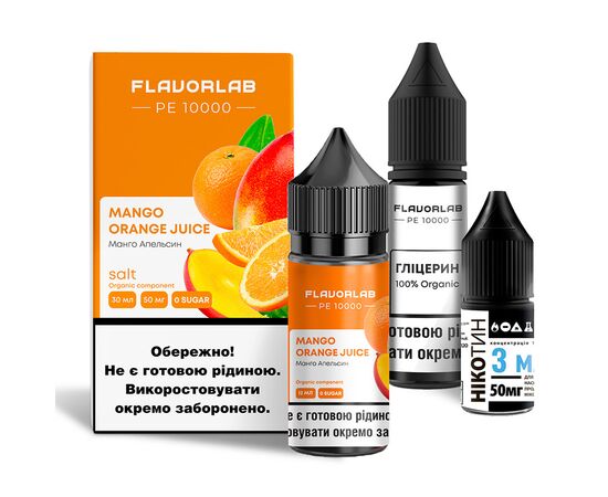 Рідина Набір Flavorlab PE 10000 Mango Orange Juice (Манго Апельсин Сік) 30мл 5% - створіть ідеальну рідину для максимально комфортного досвіду вейпінгу. Набір для самозамісу складається виключно із компонентів високої якості. Нікотин ви можете додати на свій розсуд. Якщо додасте весь нікобустер вийде 5% міцності, половину – 2,5%. Нікотин можна не додавати взагалі, вийде жижа з 0% міцності. Змішувати самозаміс потрібно у флаконі з ароматизатором, там достатньо порожнього місця.