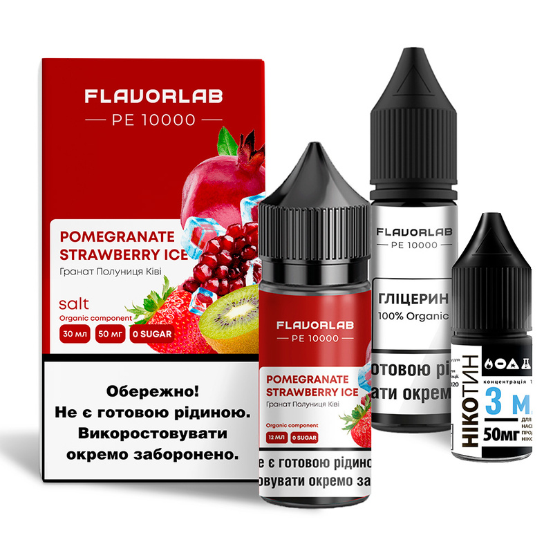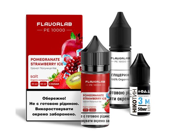 Рідина Набір Flavorlab PE 10000 Pomegranate Strawberry Ice (Гранат Полуниця Лід) 30мл 5% - створіть ідеальну рідину для максимально комфортного досвіду вейпінгу. Набір для самозамісу складається виключно із компонентів високої якості. Нікотин ви можете додати на свій розсуд. Якщо додасте весь нікобустер вийде 5% міцності, половину – 2,5%. Нікотин можна не додавати взагалі, вийде жижа з 0% міцності. Змішувати самозаміс потрібно у флаконі з ароматизатором, там достатньо порожнього місця.