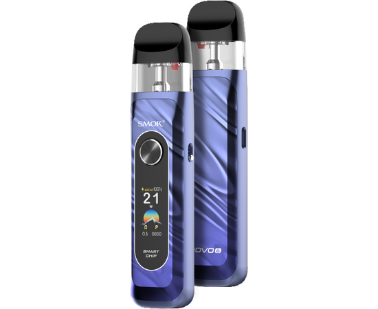 Smok Novo 6 KIT Blue Багаторазова Pod-система нового покоління. Пристрій оснащений акумулятором 1700 мАг, кольоровим TFT-екраном та регулюванням потужності до 40 Вт. Підтримує MTL та RDL, має регульований airflow, керування однією кнопкою та автозатяжку. Картриджі Novo 5 з верхньою заправкою забезпечують яскравий смак та стабільну роботу.