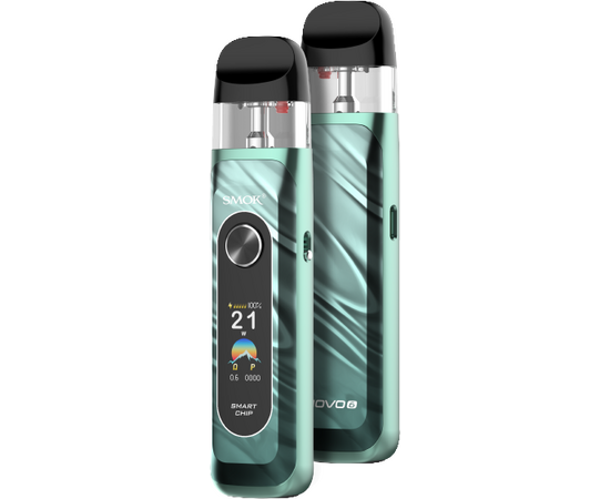 Smok Novo 6 KIT Mineral Green Багаторазова Pod-система нового покоління. Пристрій оснащений акумулятором 1700 мАг, кольоровим TFT-екраном та регулюванням потужності до 40 Вт. Підтримує MTL та RDL, має регульований airflow, керування однією кнопкою та автозатяжку. Картриджі Novo 5 з верхньою заправкою забезпечують яскравий смак та стабільну роботу.