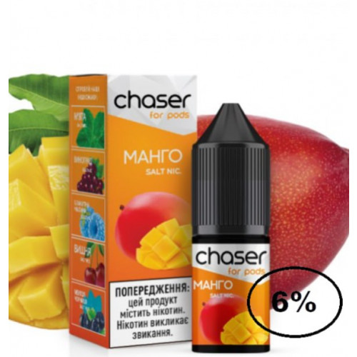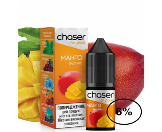 Рідина Chaser (Чейзер Манго) 10мол, 6% призначена для використання у POD системах з невеликим рівнем потужності. Виготовляється виключно з якісних компонентів. Має яскравий, насичений і натуральний аромат, а також велику кількість пари під час вейпінгу. В основі рідини лежить якісний сольовий нікотин, також для виробництва використовуються харчові ароматизатори від найкращих виробників.