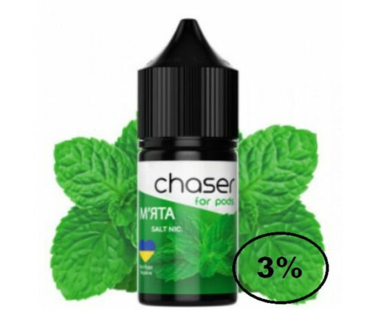 Рідина Chaser (Чейзер М'ята) 30мл, 3% виробляється з сольового нікотину, та найкращих інгредієнтів. Жижа має відмінну якість, забезпечує яскравий і натуральний смак, під час вейпінгу ви насолоджуєтеся ароматним димом. Рекомендується використовувати в POD системах із невисокими характеристиками потужності. В результаті випаровування жижі виробляється аерозоль, який набагато безпечніший за тютюновий дим.