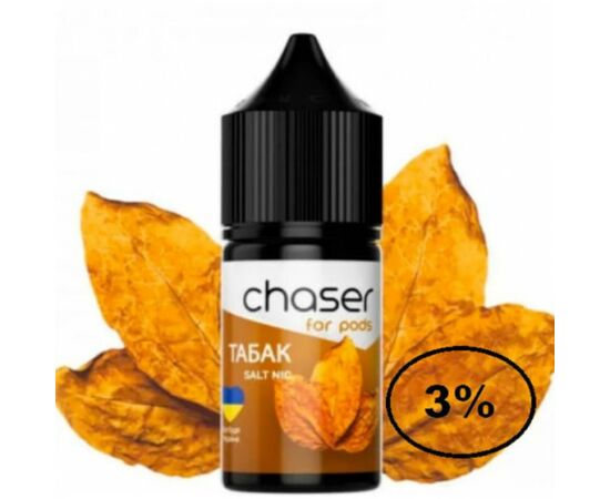 Рідина Chaser (Чейзер Тютюн) 30мл, 3% виробляється з сольового нікотину, та найкращих інгредієнтів. Жижа має відмінну якість, забезпечує яскравий і натуральний смак, під час вейпінгу ви насолоджуєтеся ароматним димом. Рекомендується використовувати в POD системах із невисокими характеристиками потужності. В результаті випаровування жижі виробляється аерозоль, який набагато безпечніший за тютюновий дим.
