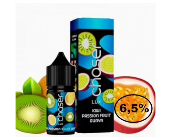 Рідина Chaser LUX Kiwi Passionfruit Guava (Чейзер Люкс Ківі Маракуя Гуава) 30мл, 6,5% призначена для використання у POD системах з невеликим рівнем потужності. Виготовляється виключно з якісних компонентів. Має яскравий, насичений і натуральний аромат, а також велику кількість пари під час вейпінгу. В основі рідини лежить якісний сольовий нікотин, також для виробництва використовуються харчові ароматизатори від найкращих виробників.