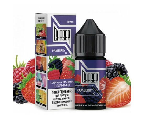 Рідина Chaser Pamberry X (Ожина Малина Полуниця) 30мл виробляється в Україні за сучасними технологіями із кращої сировини. В основі продукту лежить сольовий нікотин. Відрізняється високим показником димності та смакопередачі. Призначена для використання на POD системах з невеликим рівнем потужності, ще також може використовуватися для низькотемпературного вейпінгу на атомайзерах. Співвідношення гліцерину до пропіленгліколю 50/50.