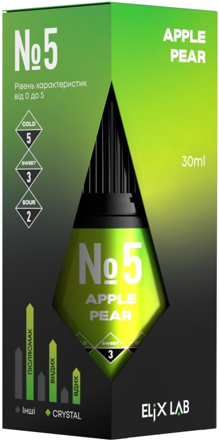 Рідина Elix Crystal Apple Pear (Яблуко Груша) 30мол 5% відрізняється змістом компонентів найвищої якості. Виготовляється з нікотину на сольовій основі. Жижа призначена для застосування у багаторазових електронних сигаретах з невеликим рівнем потужності. Під час вейпінгу на вас чекає чистий і натуральний смак, а також густі хмари пари.