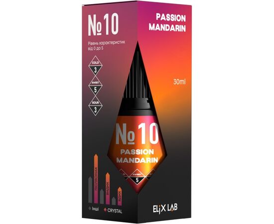 Рідина Elix Crystal Passion Mandarin (Маракуя Мандарин) 30мл 5% відрізняється змістом компонентів найвищої якості. Виготовляється з нікотину на сольовій основі. Жижа призначена для застосування у багаторазових електронних сигаретах з невеликим рівнем потужності. Під час вейпінгу на вас чекає чистий і натуральний смак, а також густі хмари пари.