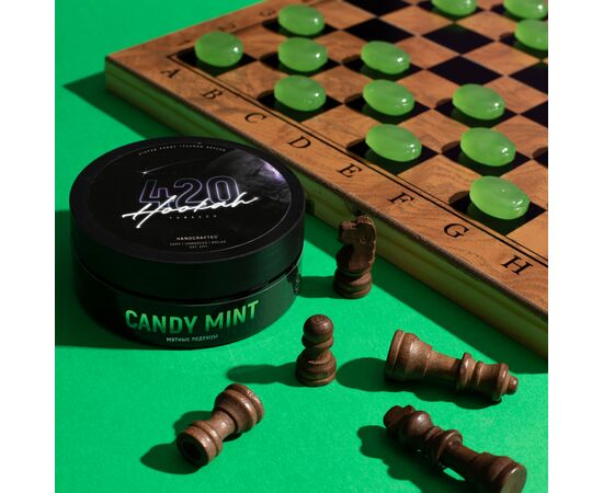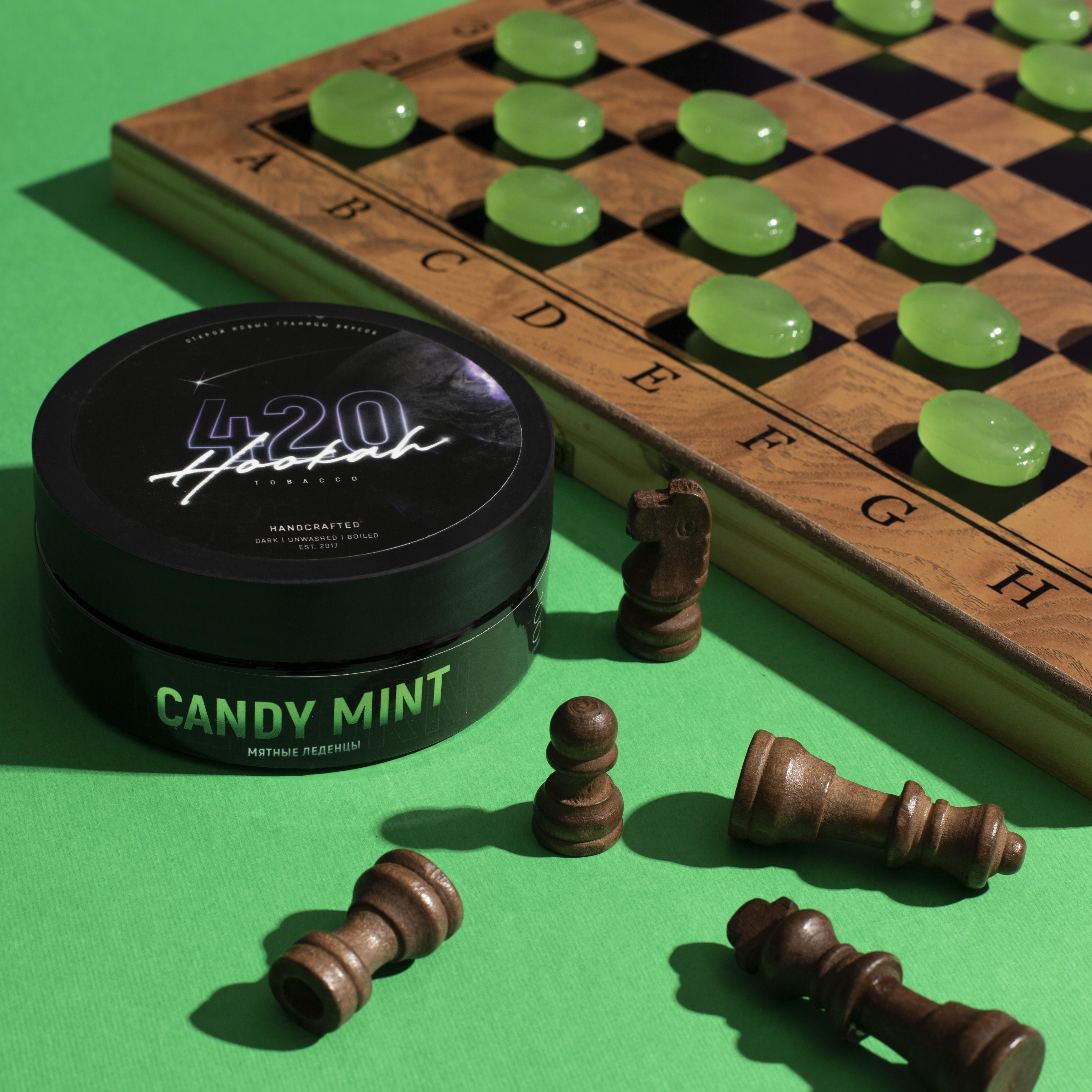 4:20 Candy Mint. Класичний освіжаючий смак солодкий м'ятних льодяників, дуже приємний і розслаблюючий. Тютюнова суміш для кальяну 4:20 виготовлена з інгредієнтів Європейського та американського виробництва. У баночці ви знайдете суміш чорного кольору з тютюновим листом Барлі та Вірджинія великої нарізки та невеликою кількістю сиропу. Під час куріння тютюн добре витримує жар від вугілля, тютюновий дим густий і у великій кількості супроводжується приємним та натуральним ароматом.