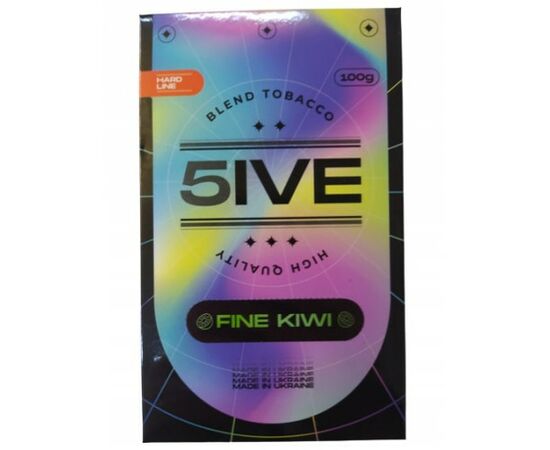 Тютюн 5IVE hard Fine Kiwi (Ківі) 100грам відрізняється високим рівнем міцності, виробляється в Україні з кращої сировини, такої як добірний тютюновий лист преміальних сортів Золота Вірджинія та Барлі. Продукт характеризується високим рівнем жаростійкості та відмінною передачею смаку. Тютюновий лист нарізаний дрібно і щедро просочений у сиропі з гліцерину, патоки та харчових ароматизаторів.