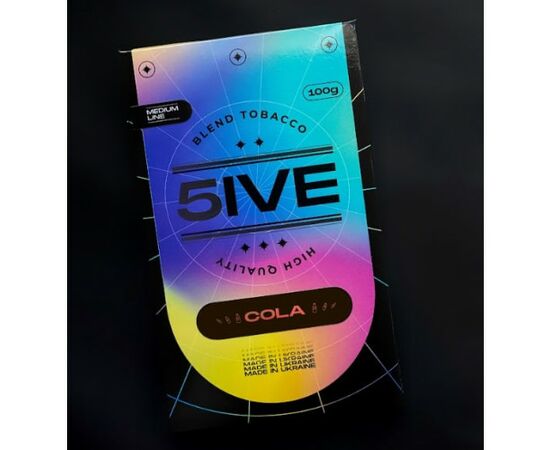 Тютюн 5IVE medium Cola(Кола) 100грам виробляється за сучасними технологіями із застосуванням оригінальних рецептур із кращої натуральної сировини. До складу курильної суміші не входить сольовий нікотин. В основі продукту лежить добірний тютюновий листок преміального сорту. У виробництві використовуються найкращі ароматизатори, натуральний гліцерин та патока.