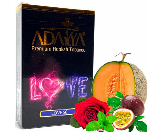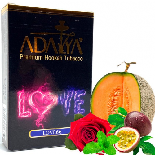 Тютюн Adalya Love 66. Приголомшлива суміш свіжої та стиглої дині з екзотичною маракуєю, а також нотками троянди та м'яти. Вирощений під щедрим сонцем Туреччини тютюновий лист відібраний та дбайливо оброблений з додаванням якісних ароматизаторів ліг в основу цієї суміші для куріння кальяну. Має невисоку фортецю, але в той же час чудову димність. Суміш добре переносить жар вугілля. li> Димність: Висока; Кислота: Легка кислинка; Солодкість: Солодкий; Країна виробник: Туреччина; Вага: 50 гр; Фортеця: Середній; Тип суміші: Тютюн; Упаковка: Пачка
