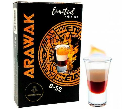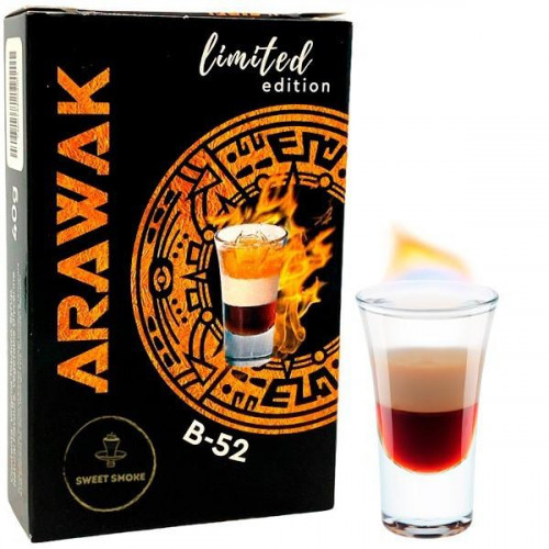 Arawak B-52. Смак знаменитого коктейлю грає нотками кави, вершків та цитрусових. Заправка для кальяну на основі високоякісного тютюнового листа преміальних сортів з перевагою Вірджинія голд завоювала довіру любителів калана завдяки натуральному смаку легкої міцності та відмінним показникам жаростійкості. Виробникам вдалося максимально прибрати гіркоту тютюну і домогтися м'якого смаку. Дуже висока; Країна виробник: Домінікана; Вага: 40 гр; Фортеця: Легка; /li> Тип суміші: ТютюнСмак: Аравак.