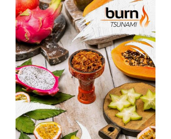 Burn Tsunami зі смаком екзотичних фруктів – це заправка для кальяну преміальної якості, яка виготовляється в США. Як сировина використовується тютюновий лист преміального сорту Virginia Gold, вирощений на безкраїх полях Франції. нарізаний на середні фрагменти і добре просочений сиропом. Суміш упакована в зручну зип упаковку, завдяки якій смакові якості зберігаються протягом довгого періоду часу.