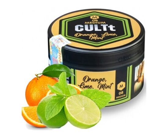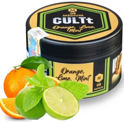 Тютюн Cult Medium M08 Orange Lime Mint (Апельсин Лайм М'ята) 100гр відрізняється збалансованим поєднанням усіх ноток смаку та натурального тютюнового листа. Заправка для куріння кальяну відмінно входить у соло, але може стати основою для створення оригінального міксу. Завдяки ароматизаторам високої якості під час куріння добре відчувається смак, а також вирізняються густі клуби диму. Курильна суміш добре переносить високу температуру. Рекомендується використовувати глиняну чашу.
