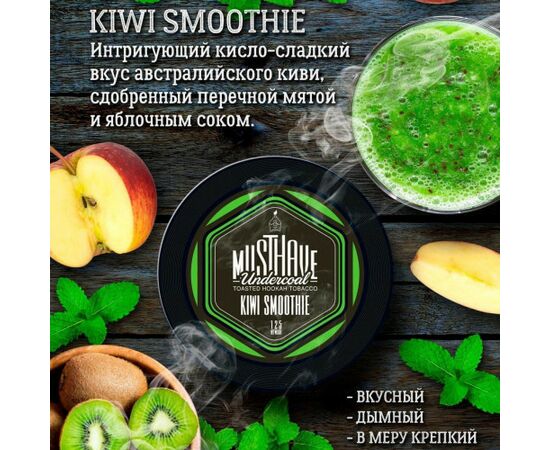 Must Have Kiwi Smoothie. Стигле ківі зі своїми кисло-солодкими нотками. Доповнено приємною м'ятою та невеликою часткою аромату яблучного соку. Свій особливий смак заправка для кальяну Must Have набуває в результаті бленду світло-помаранчевого та темно-коричневого тютюнового листя Берлі, яке виготовляється у 7 країнах світу. У смаковій гаммі кожного назви є природні нотки тютюну Barly. У виробництві використовуються ароматизатори з Європи, США і Японії.