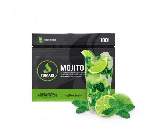 Тютюн Fumari Mojito Mojo (Фумарі Мохіто) 100 грам виробляється в США з натуральних та якісних компонентів, поставляється у зручному пакеті із зіп-застібкою. До складу продукту входить натуральний тютюновий лист преміального сорту, ароматизатор для харчової промисловості, гліцерин та патока. Заправка для кальяну підійде як досвідченим любителям ароматного диму, так і новачкам. Під час покуру ви відчуєте насичений та натуральний аромат.