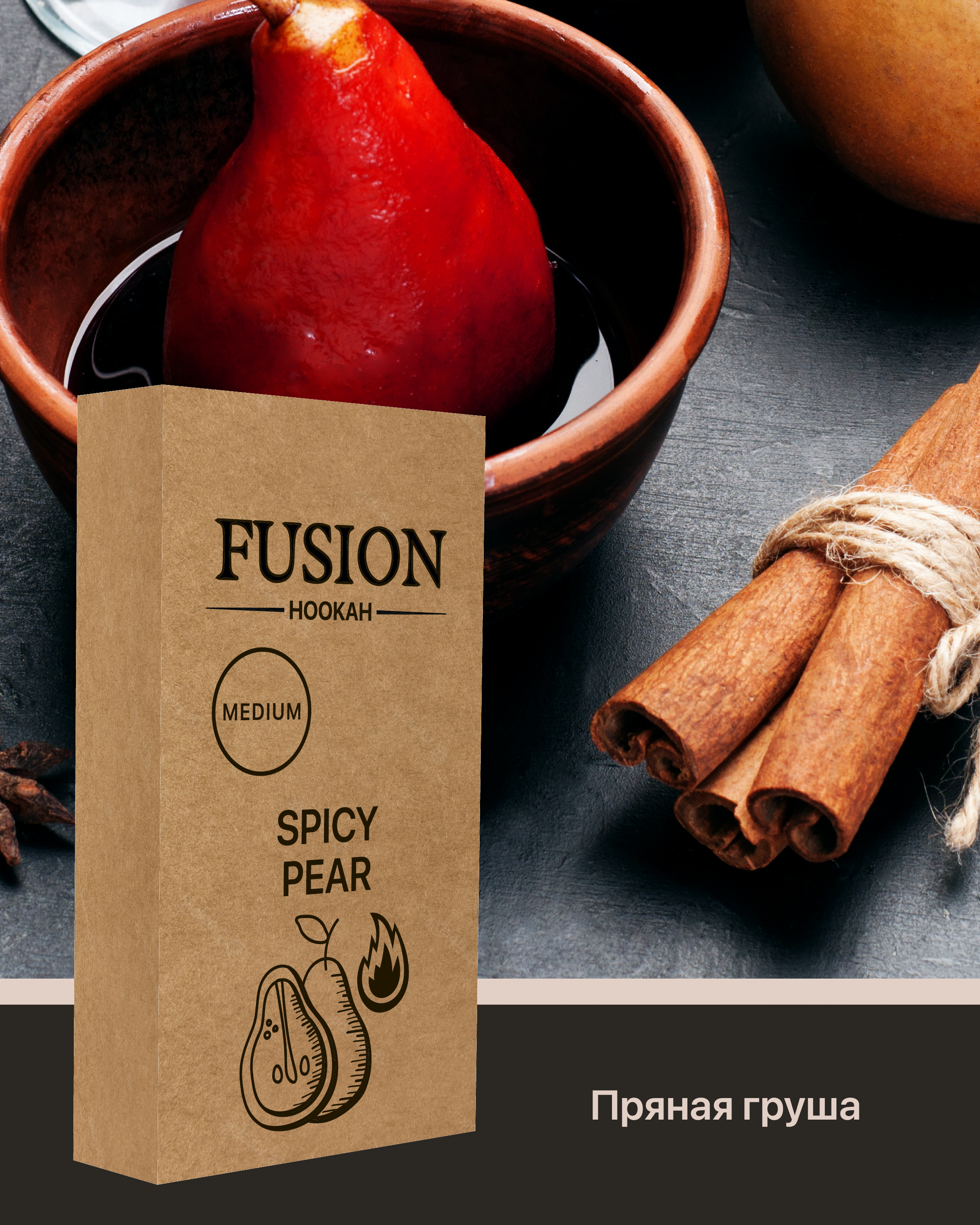 Тютюн Fusion Medium Spicy Pear. Солодощі груші розбавлені спеціями, що робить смак більш пікантним. Це Український бренд тютюну для кальяну, який виготовляється з добірного листя сорту Burley, а також ароматизаторів Німецького виробництва високої якості. Під час тютюн куріння характеризується приємним ароматом та великою кількістю диму. Серія Medium відрізняється середнім рівнем фортеці. Тютюн поставляється в зручних картонних 100 грамових упаковках. Кислота: Легка кислинка; Солодкість: Солодкий; Смак: Пряна Груша; Країна виробник: Україна; Вага: 100 гр; Фортеця: Міцний; Тип суміші: Тютюн; Упаковка: Пачка