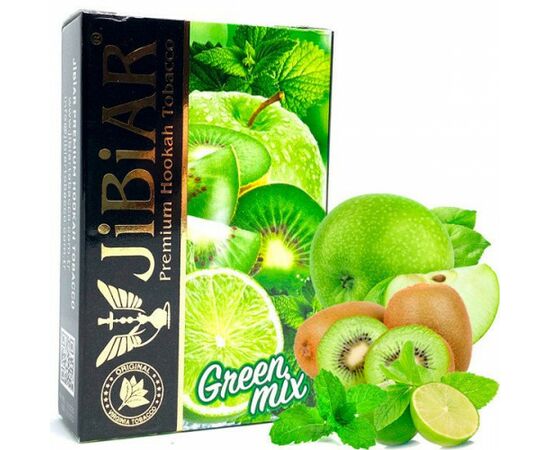 Тютюн Jibiar Green Mix (Джибіар Грін Мікс) 50 грам порадує Вас оригінальним, яскравим та натуральним літнім ароматом. Виробляється заправка для кальяну в Туреччині з добірної сировини. Основою для продукту є якісний тютюновий лист преміальної якості Вірджинія Голд. До складу продукту також входить цукрова патока, гліцерин та ароматизатори, сертифіковані для використання в харчовій промисловості.