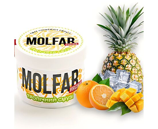 Тютюн Molfar Virginia Line Тропічний Смузі (Ананас Апельсин Манго Льод) 40 гр тримає приємний, ароматний та насичений смак від першої до останньої затяжки протягом тривалого часу куріння кальяну. Заправка для кальяну відрізняється високим рівнем жаростійкості та димності. Виготовляється продукт із тютюнового листа високої якості преміального сорту. Для того щоб смак був максимально натуральним, виробник рекомендує використовувати глиняну чашу.