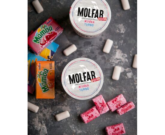 Тютюн Molfar Virginia Жуйка Turbo (Фруктова Жуйка) 40 гр - український бренд тютюну для кальяну, що виробляється вручну на Закарпатті. Назва походить від карпатського слова "мольфар", що означає знахаря або чаклуна в гуцульській культурі. Належить до лінійки Virginia. Тютюн підходить як для самостійного використання, так і для створення міксів. Популярність бренду "Мольфар" обумовлена поєднанням високої якості, натуральності інгредієнтів, чудової жаростійкості, хорошої смакопередачі та доступної ціни.