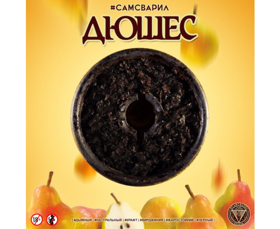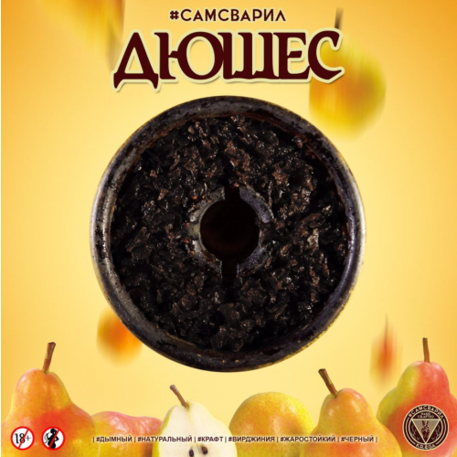 Тютюн Сам Зварив Дюшес 100 гр. Та сама дюшісна груша, відома своєю ароматністю та насолодою. Сам Сварил належить до крафтових заправок для кальяну. Має високу жаростійкість, має солодкий смак завдяки виготовленню з добірного тютюнового листя сорту Virginia Gold. Готова суміш має чорний колір, що не властиве тютюнових листів цього сорту. До складу продукту також входять ароматизатори українського та німецького виробництва. В упаковці знаходиться невелика кількість сиропу, міцність суміші середня.