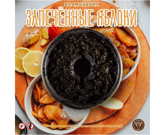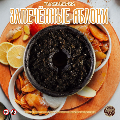 Тютюн Сам Зварив Запечене Яблуко 100 гр. Ідеальне частування, запечене яблуко добре поєднується із прянощами. Сам Сварил належить до крафтових заправок для кальяну. Має високу жаростійкість, має солодкий смак завдяки виготовленню з добірного тютюнового листя сорту Virginia Gold. Готова суміш має чорний колір, що не властиве тютюнових листів цього сорту. До складу продукту також входять ароматизатори українського та німецького виробництва. В упаковці знаходиться невелика кількість сиропу, міцність суміші середня.