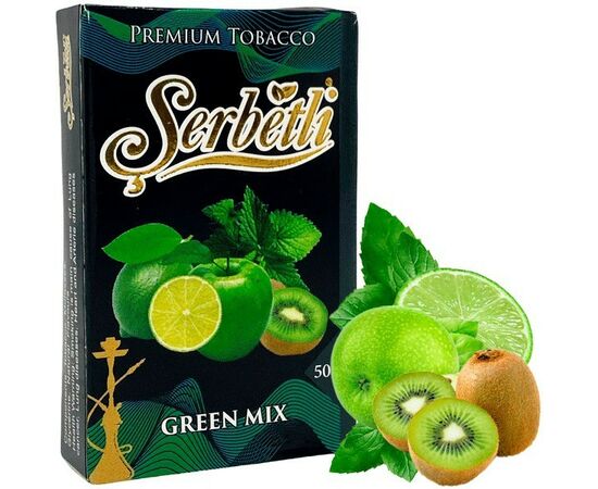 Тютюн Serbetli Green Mix (Щербетлі Грін Мікс) 50 г зі смаком зеленого яблука та м'яти виробляється в Туреччині з якісної сировини. Під час куріння ви відчуєте натуральний та яскравий аромат. Тютюнове листя преміального сорту вимочується в сиропі з натурального меду, завдяки чому позбавляється гіркоти і набуває приємного солодкуватого смаку. Марка Щербетлі - це найпопулярніший виробник тютюнових сумішей.